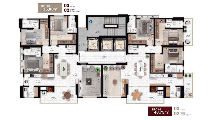 • Tipo 01 com 135m² e tipo 02 com 148,75m²