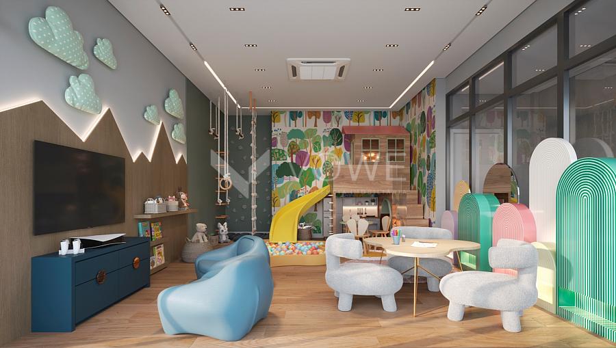 No quinto andar, dois salões gourmet integrados, fireplaces, playground, sala de jogos e espaços fitness e kids.