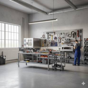 A disposição dos ambientes deve favorecer a organização e o fluxo de trabalho. Uma empresa de manutenção de fornos profissionais precisa de áreas distintas para cada função: oficina principal, estoque de peças, almoxarifado, área administrativa e eventualmente um setor de testes. Essa divisão otimiza o desempenho da equipe e minimiza riscos de acidentes.